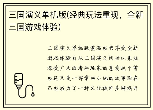 三国演义单机版(经典玩法重现,全新三国游戏体验)